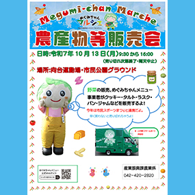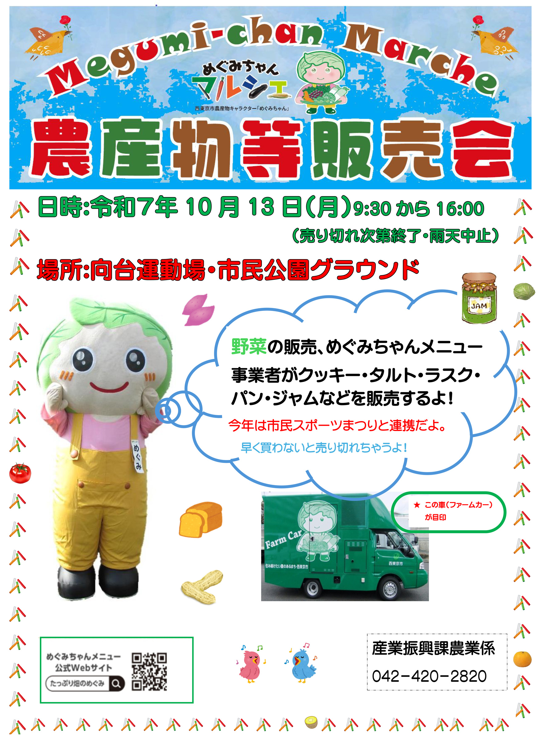 開催日 2025年10月13日(月・祝)9:30~16:00※雨天中止 場所 向台運動場・市民公園グラウンド 今回は、市民スポーツまつりと合同開催。市内農業者の新鮮野菜&めぐみちゃんメニュー事業者の焼き菓子やジャムなどを販売します! 売り切れ次第終了ですので、ぜひお早めにお越しください。